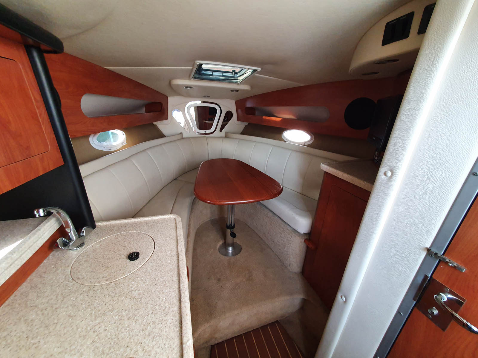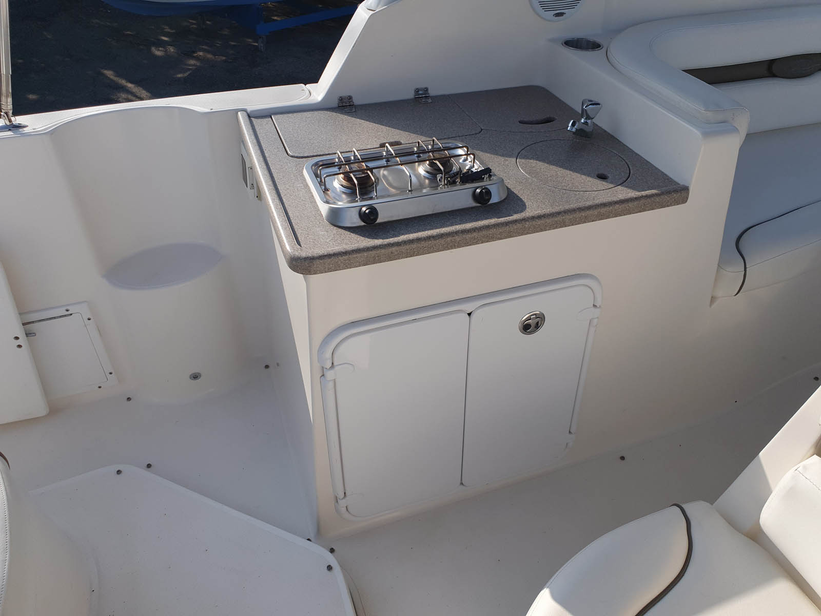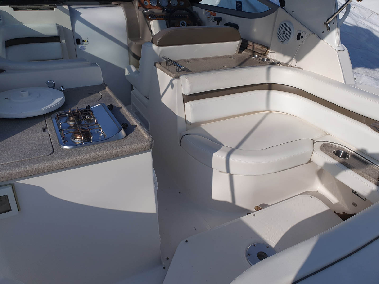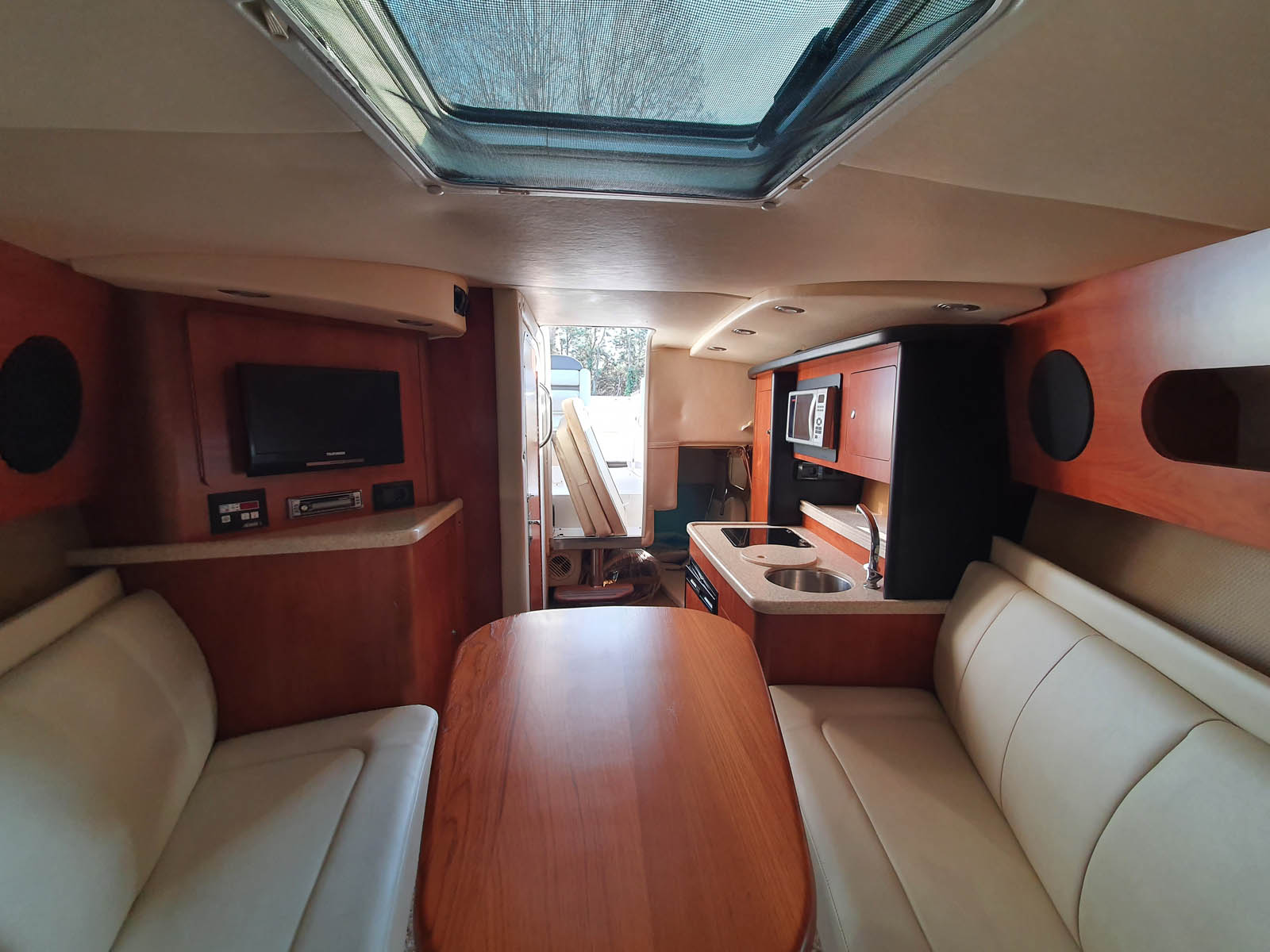 Gepflegte Motoryacht, nur Süßwasser, Bug-Dinette umwandelbar in ein Doppelbett, Doppelkoje achtern, ausgestattete Küchenzeile, separates Bad. Zum Zubehör gehören eine elektrische Winde, eine Stereoanlage, eine Heckdusche, eine Cockpitabdeckung, eine Markise für das Wohnmobil, eine Klimaanlage, eine Mikrowelle, ein GPS und ein UKW-Gerät.