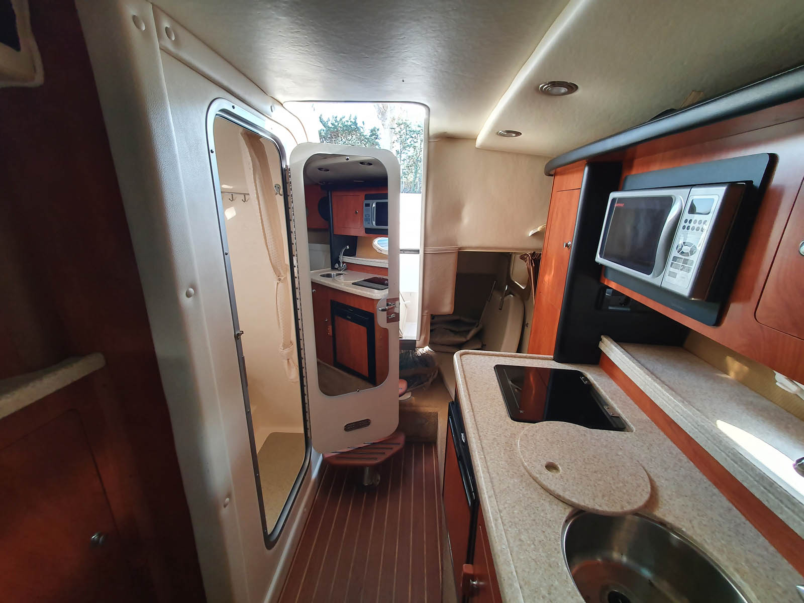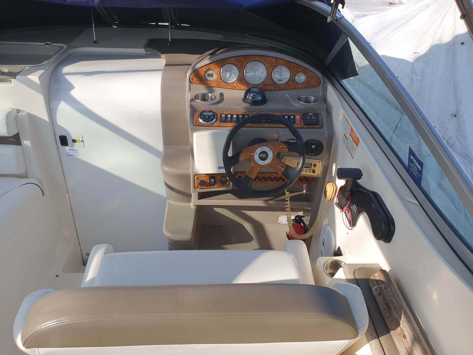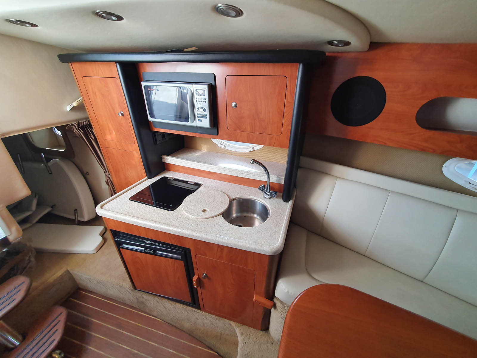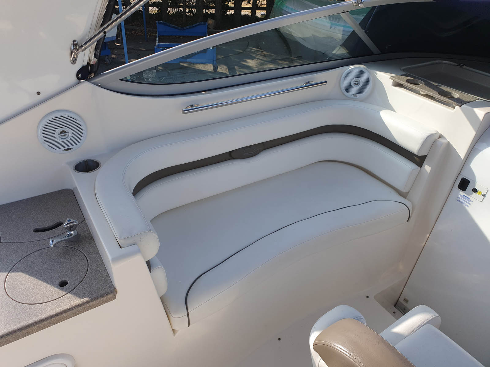 Gepflegte Motoryacht, nur Süßwasser, Bug-Dinette umwandelbar in ein Doppelbett, Doppelkoje achtern, ausgestattete Küchenzeile, separates Bad. Zum Zubehör gehören eine elektrische Winde, eine Stereoanlage, eine Heckdusche, eine Cockpitabdeckung, eine Markise für das Wohnmobil, eine Klimaanlage, eine Mikrowelle, ein GPS und ein UKW-Gerät.